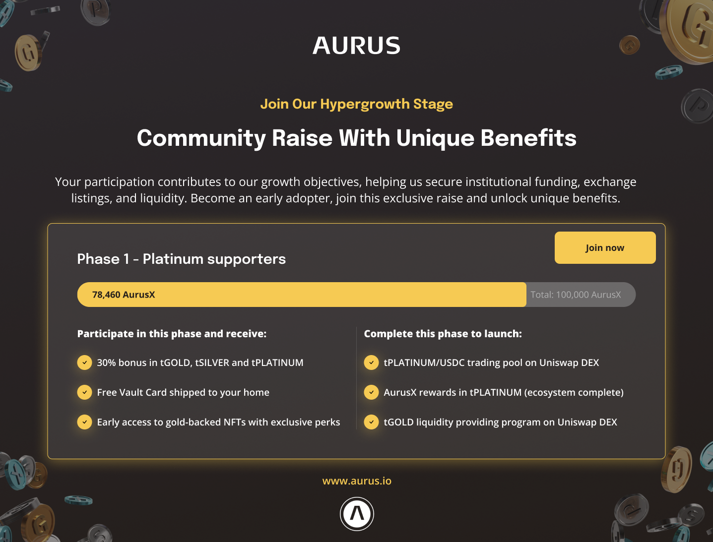 Founded in 2019, Aurus is taking the lead in revolutionizing the precious metals market through the power of tokenization. With a firm commitment to efficiency and inclusivity, Aurus is on a mission to democratize access to these valuable assets. Now, Aurus is taking its vision to new heights with a Hypergrowth Funding Raise, an initiative that will propel the company into its next phase of groundbreaking innovation and global expansion while offering exclusive benefits and opportunities to earn gold, silver, and platinum.
