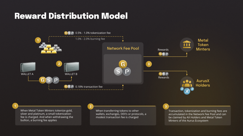 The ecosystem’s foundations are designed to align the interests of all its participants. In addition to AurusX holders, providers of precious metals to the Aurus ecosystem also receive a proportional share of the ecosystem rewards for their contribution. The fee distribution model works as follows: