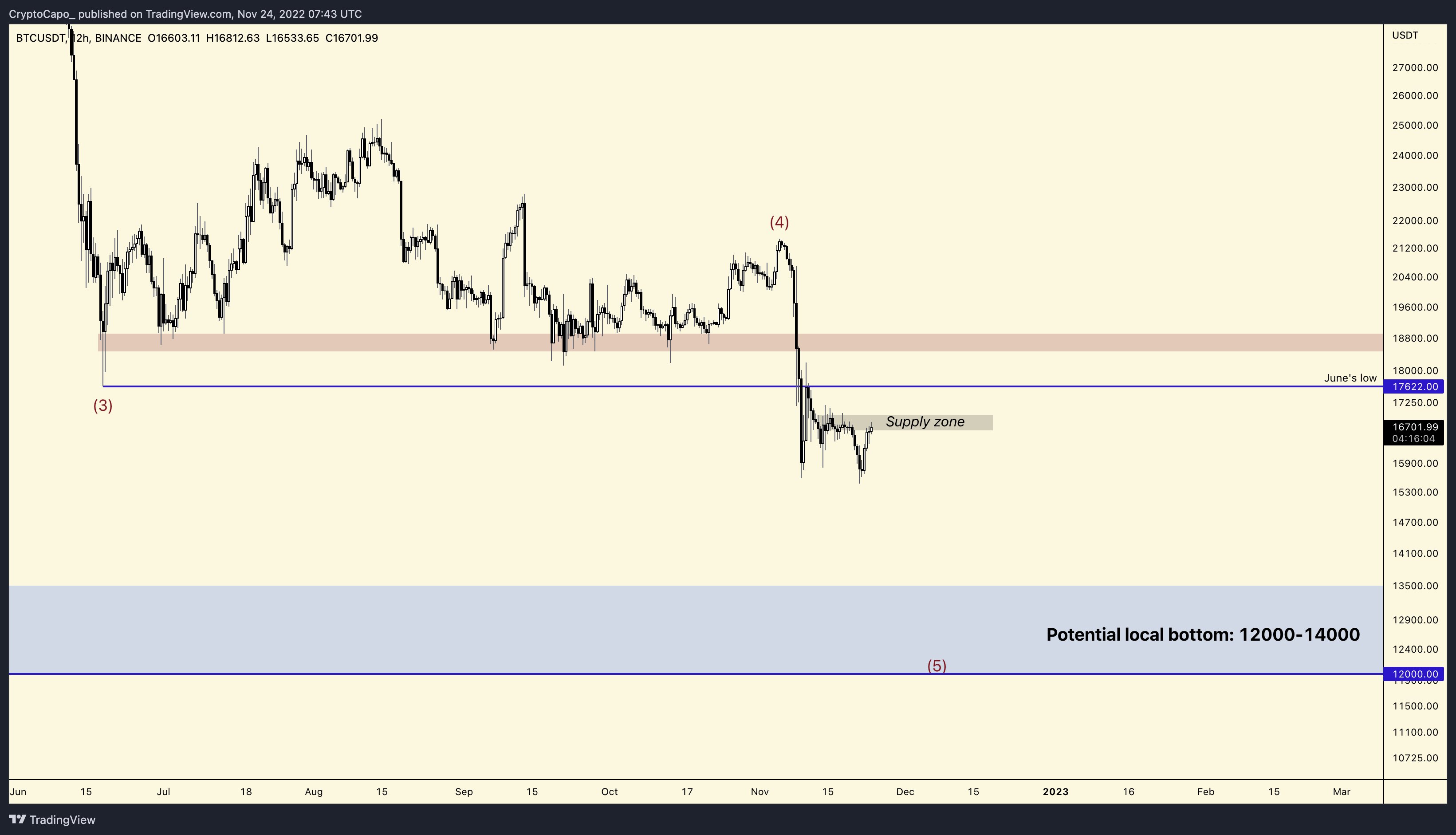 He notes that he expects the king crypto to form a local bottom at the $12,000 to $14,000 price range.