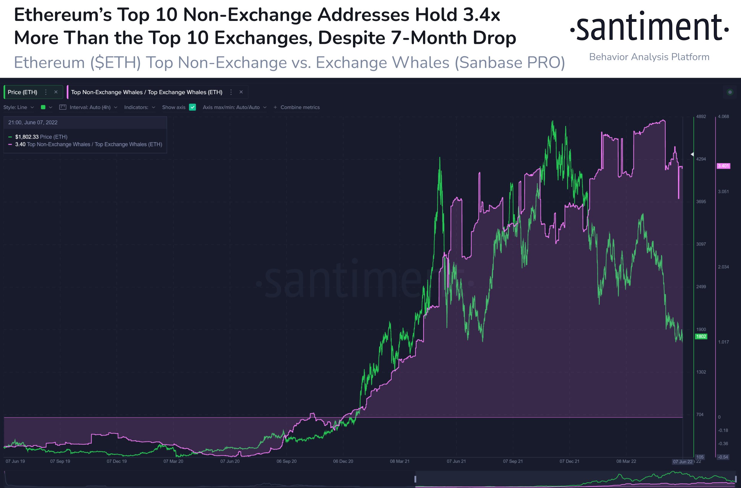 According to Santiment, the top 10 non-exchange wallets maintain a high ratio of Ethereum in their portfolio and now hold 3.4 times more ETH than exchanges.